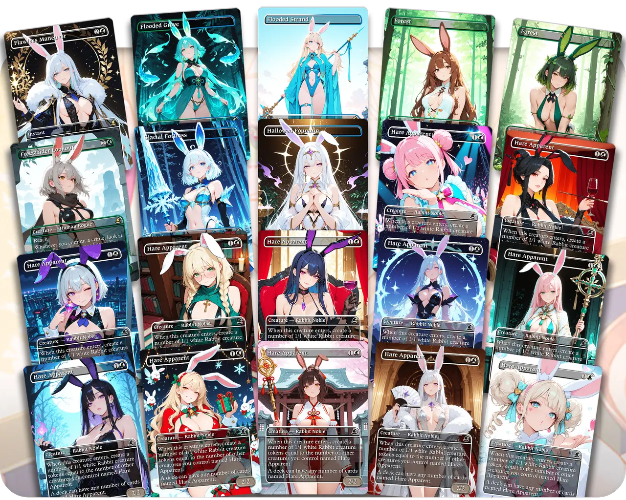 Ms. Bumbleflower leads a fast-paced go-wide strategy packed with hasty hops, token swarms, and cheeky tricks. This deck is all about flooding the board with energetic waifus and outmaneuvering opponents with quick plays and synergy-driven turns. Lighthearted and fun, but surprisingly effective.