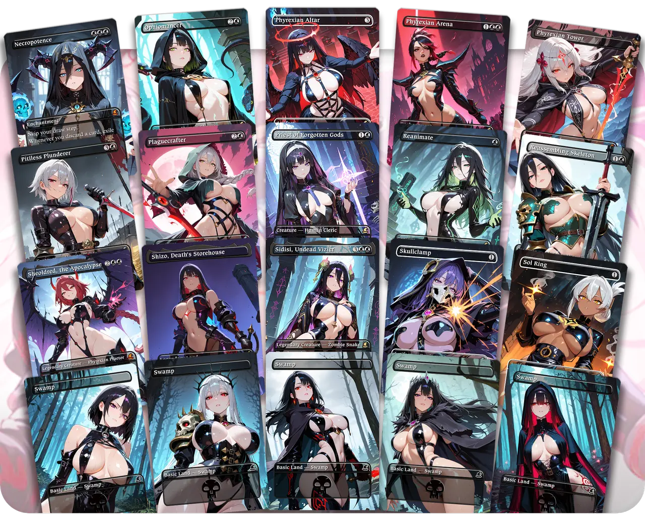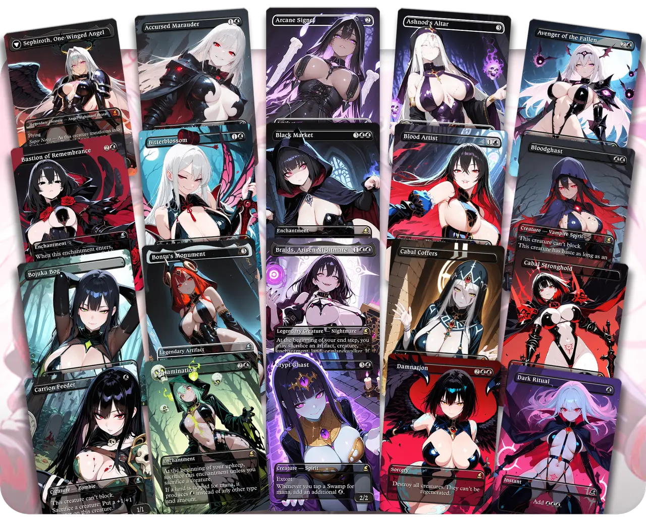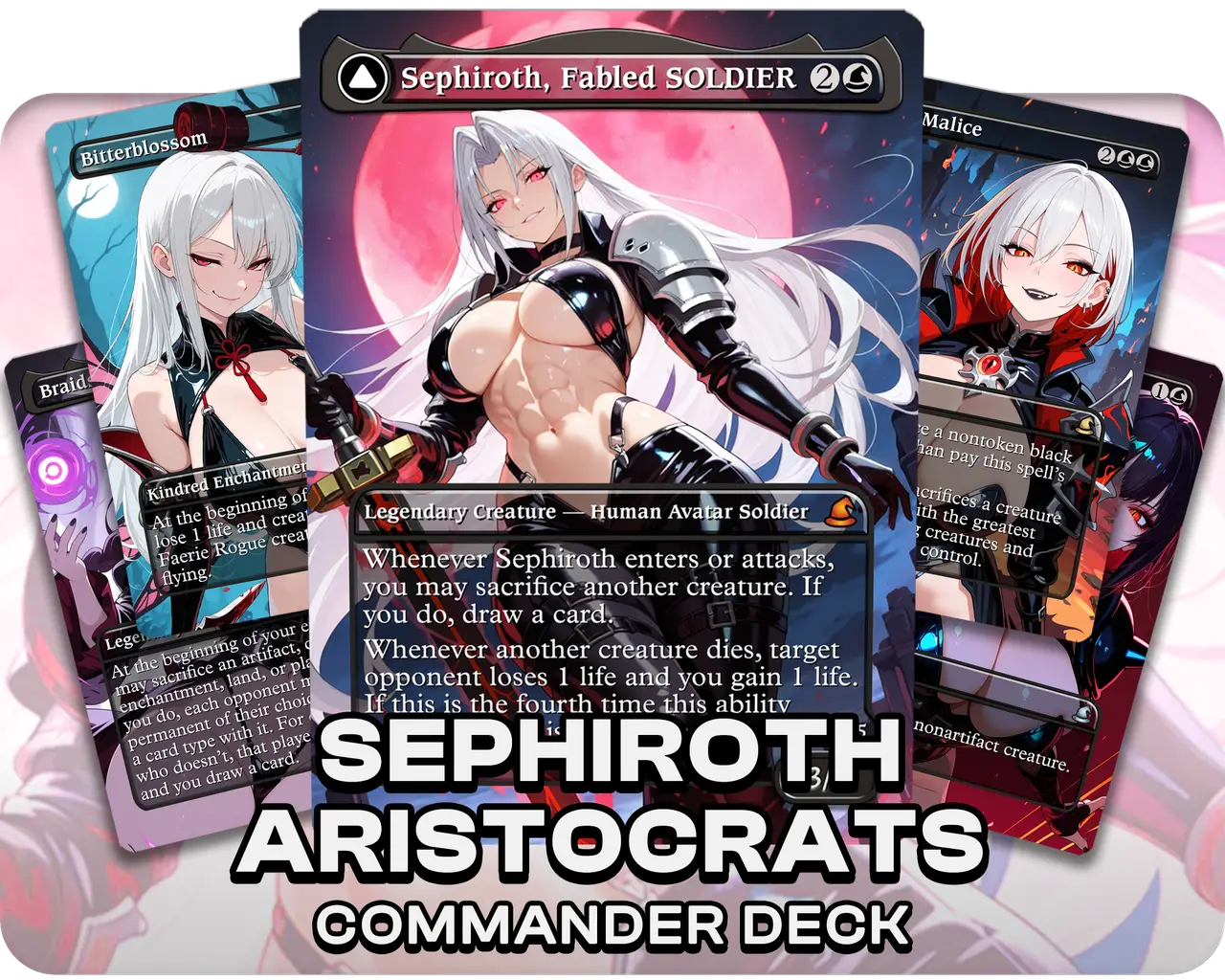 Built around the classic Aristocrats strategy, Sephiroth uses a steady stream of sacrifice fodder and death payoffs to drain opponents while growing her dark court. You'll recur creatures, trigger life loss and gain, and overwhelm the board with waifus who only grow stronger the more they die. A flavorful and synergistic engine deck for casual tables.